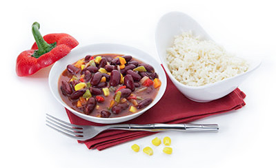 Wasser, zubereiteter Reis 23% (vorgekochter Reis, Rapsöl, Salz), rehydrierte rote Bohnen 13%, rote und grüne Paprika, Karotten, Zuckermais 4,5%, Tomatenmark, Zwiebeln, Sojaprotein, Rapsöl, Gewürze und Kräuter, Salz, Stärke, natürliches Aroma.