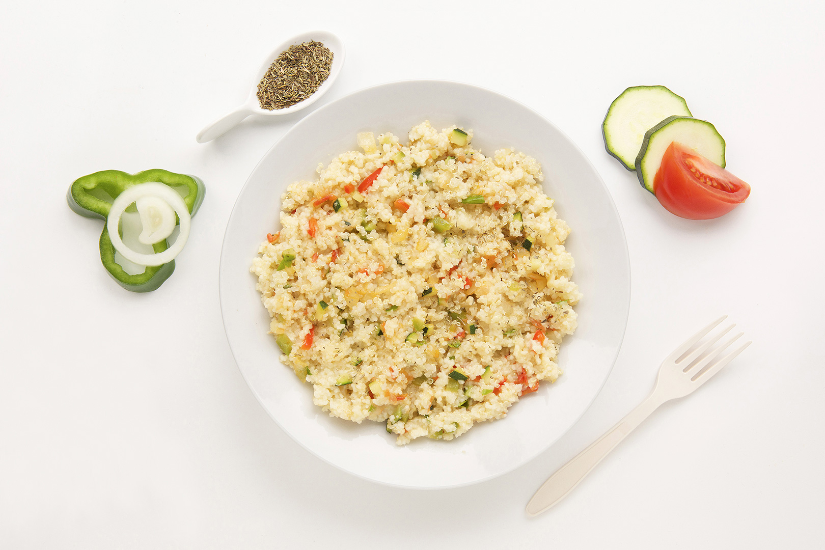 Hartweizengrieß (Gluten) 70,24%, weiße Quinoa 20,5%, getrocknetes Gemüse (Paprika, Zwiebel, Tomate, Zucchini), Salz, natürliche Aromen, Kräuter.